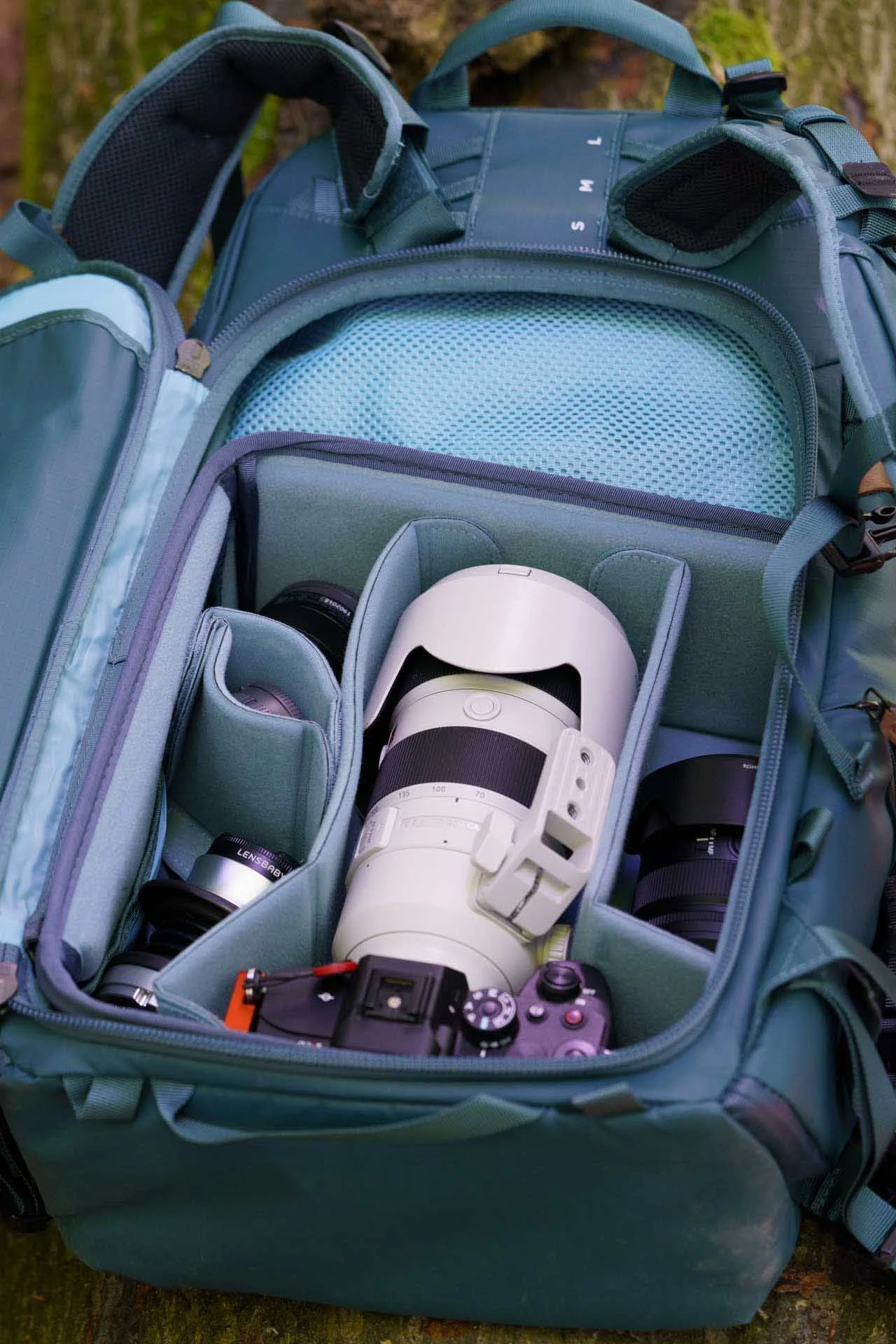The Shimoda Explore 30 v2 Women’s Series reviewed here comes with the Medium Mirrorless Core Unit, which can hold a full-frame, single-grip mirrorless camera up to 12cm tall and a few lenses including a 70-200mm f/2.8. I used to carry a range of cameras and lenses, including a Sony A7RV with a 70-200mm f/8 lens mounted and four other lenses.
